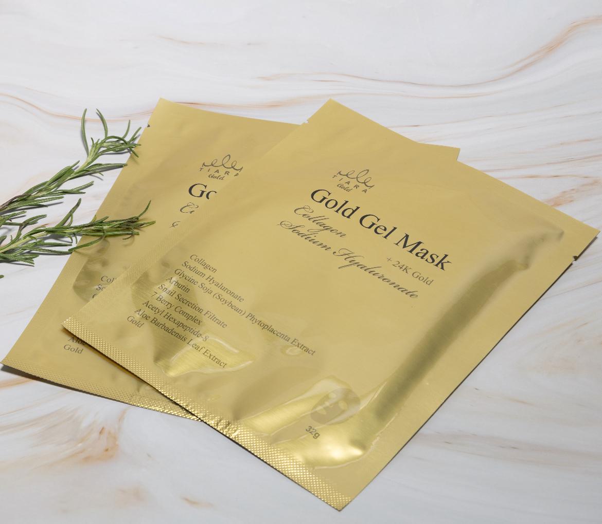 Gold Gel Mask contiene colágeno, hialuronato de sodio, glicine de soja, arbutin, FILTRADO DE SECRECIÓN DE CARACOL, complejo de siete bayas, hexapéptido de acetil-8, extracto de hoja de aloe barbadensis y ORO de 24K.