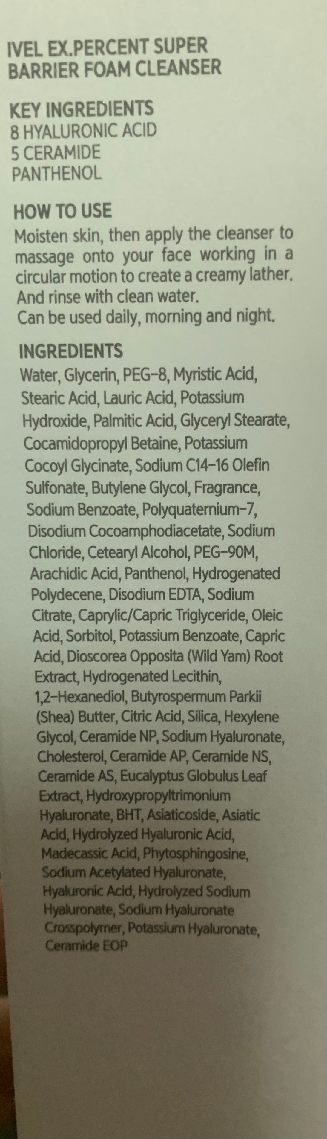 Agua, pantenol, ácido mirísticio, ácido esteárico, ácido láurico, ácido pálmico, manteca de karité, ácido citrico, hidróxido de potasio, betaína, cocoil glicinato de potasio, ceramida AP, ceramida NS, ceramida AS, extracto de hoja de eucalipto, ceramida NP, ácido asiático, ácido hialurónico hidrolizado, ácido hialurónico, asiáticosido, ácido madecásico, fitoesfingosina, polímero cruzado de hialuronato de sodio, ácido oleico, ceramida EOP,extracto de raíz de dioscorea (ñame silvestre).