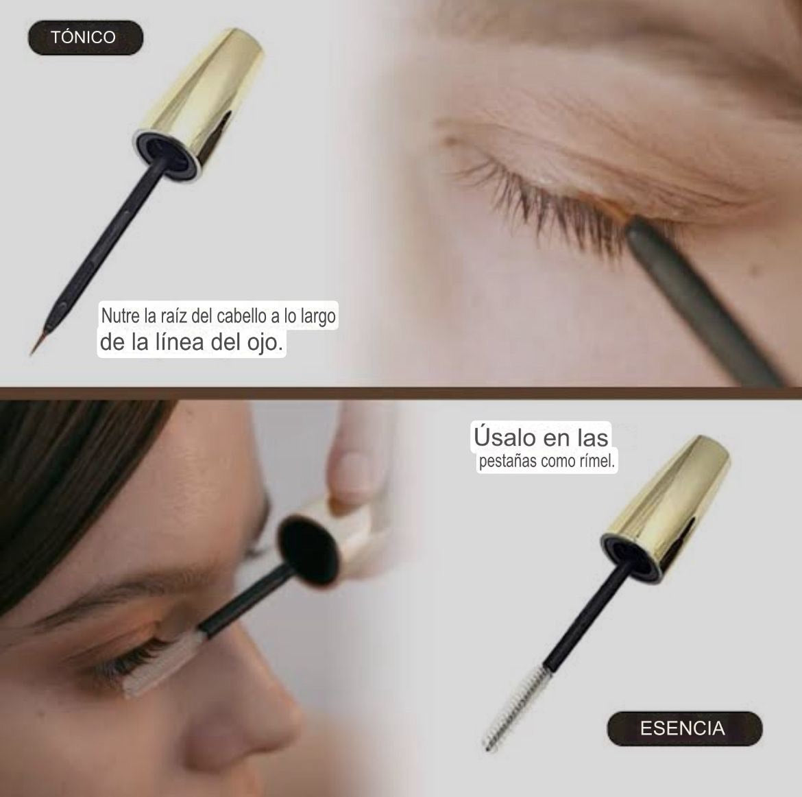 Aplicar con la cara limpia, aplicar en la línea de la raíz con el pincel del tónico y en las pestañas aplicar con el goupillon de la raíz a las puntas el sérum. El sérum también se puede aplicar en las cejas.